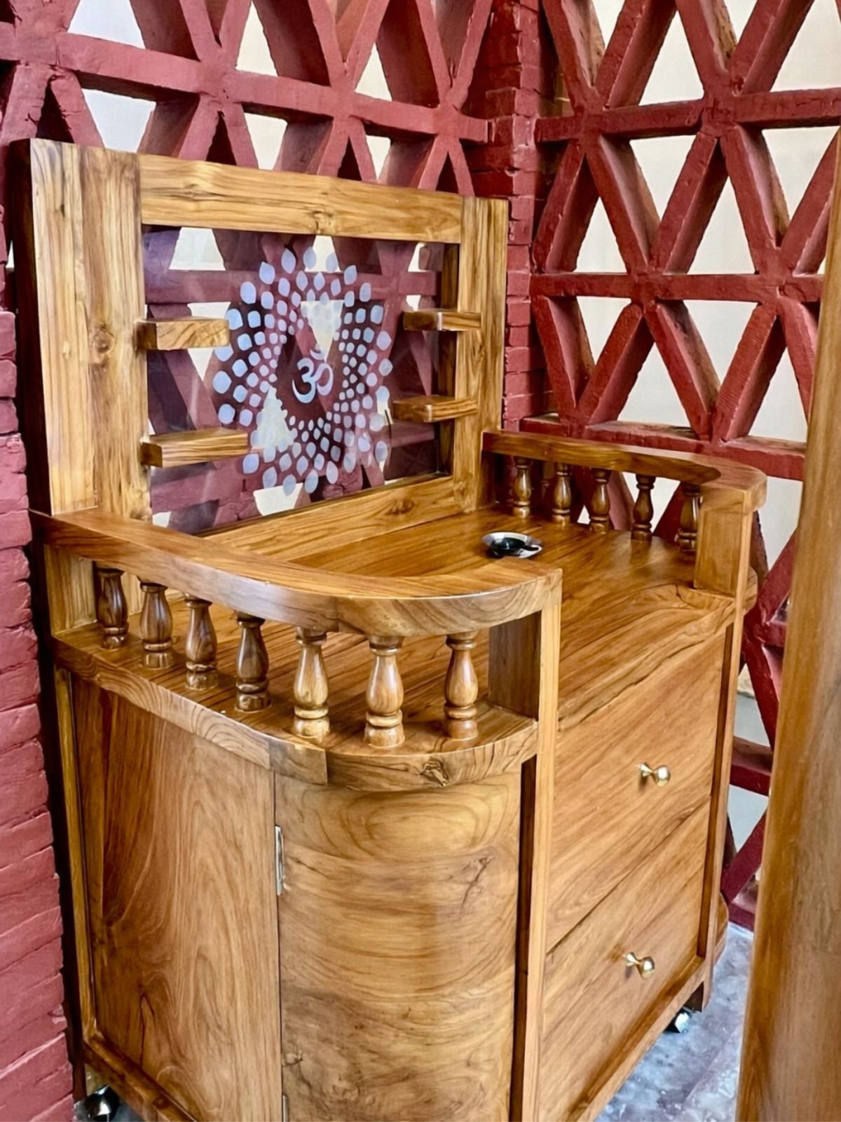 The mandir is beautifully handcrafted and carved by skilled artisans, highlighting fine detailing and traditional craftsmanship. From the strong wooden pillars to the intricately designed structure, every element has been carefully created to bring warmth, serenity, and character to the space.
