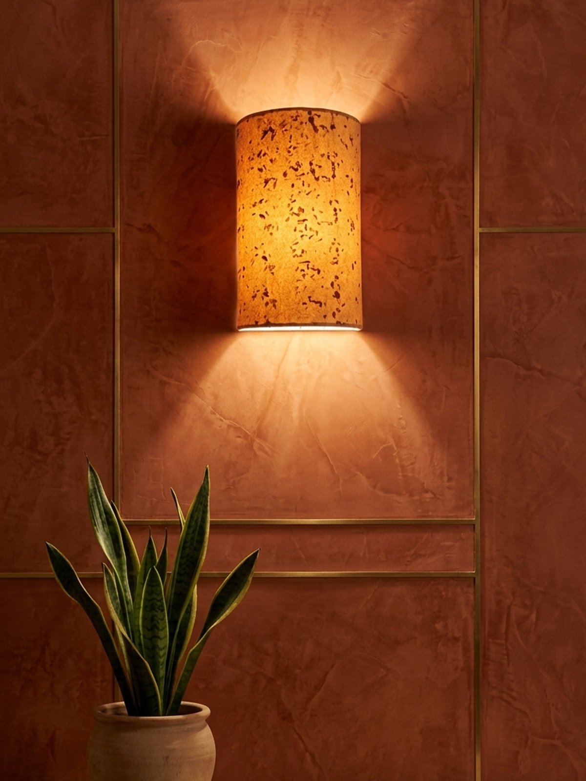 This handcrafted Marigold Glow tall wall lamp shade is made from fabric naturally dyed with marigold flowers, creating warm earthy tones and beautiful organic textures. When lit, it casts a soft, soothing glow that adds warmth and charm to any space.