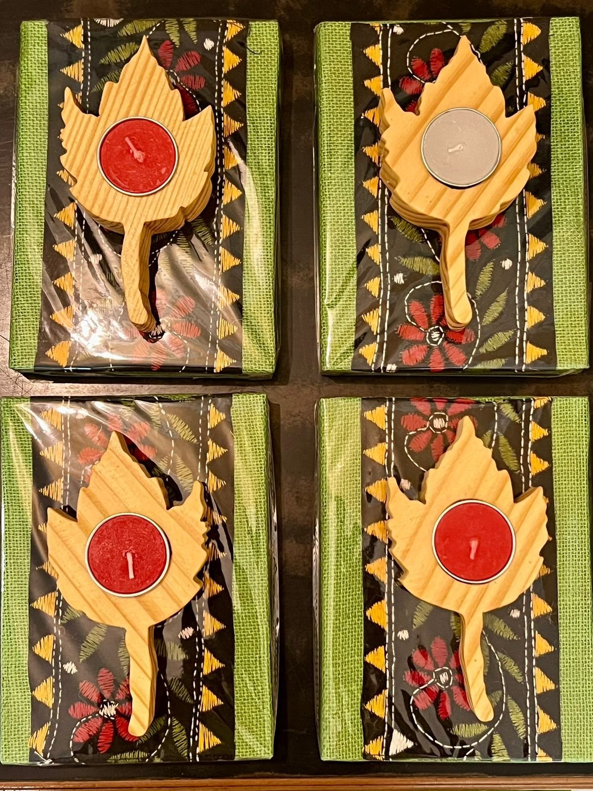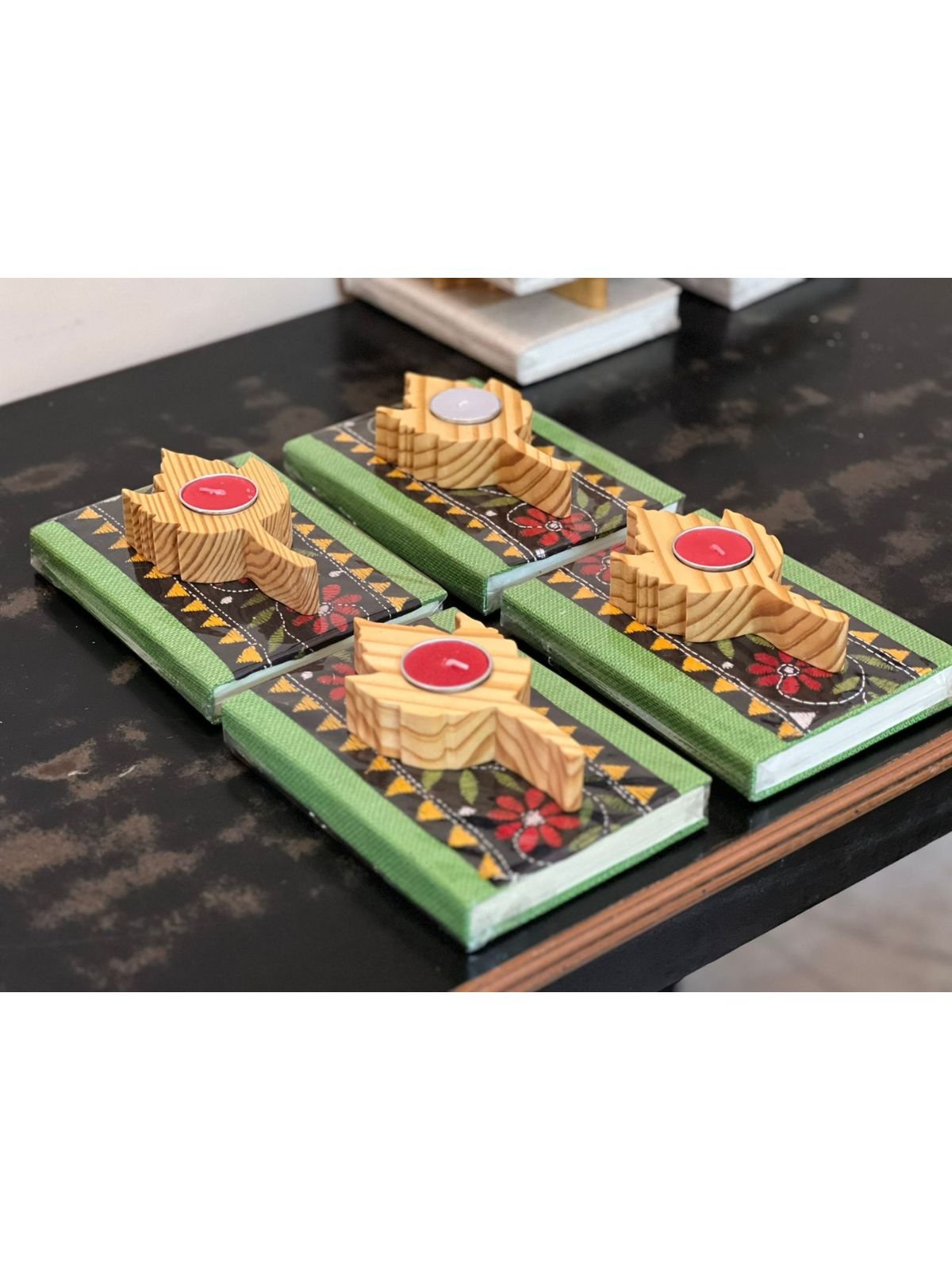 We curated a bespoke gift ensemble featuring 40 thoughtfully prepared sets: 20 with handcrafted nettle diaries and 20 with intricately embroidered Kantha diaries, each beautifully paired with a wooden maple tealight holder made from pine wood.